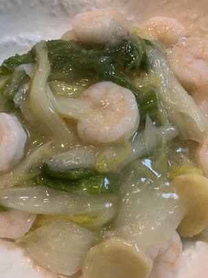 今日のQPで見た超カンタンな即席料理。フライパンに水と鶏ガラスープの素、塩、砂糖を入れて煮立て、削ぎ切りにした白菜の芯とざく切りした葉、生姜の薄切り、斜め薄切りにした長ネギを加えて5分ほどしっかり煮込んでからカタクリ粉をまぶしたむきエビを入れて火を通し、仕上げにゴマ油を回しかけただけ。