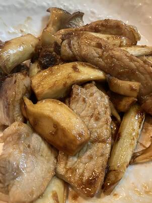 今日のQPで見た超カンタンな炒めもの。トンカツ用ロース肉を四等分して炒め、ぶつ切りした長ネギと縦4等分に割いたエリンギを炒め合わせ、醤油、黒酢、砂糖、おろし生姜の合わせ調味料を回しかけて仕上げました(^^ゞ