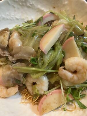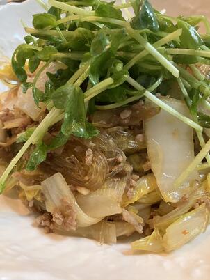 一昨日のQP料理を寒い今日に合わせました(^^ゞ干し椎茸の戻し汁に紹興酒を加えて煮立て、豚バラ肉と鶏もも肉を入れて火を通し、さらに白菜と戻した椎茸と生姜の千切りを加えてじっくりと40分ほど煮込んでから春雨を入れて、仕上げにゴマ油を垂らす。取り分けてから粗塩と一味を振って食す。干し椎茸の戻し汁は冷蔵庫で一晩置いて作り、40分煮込む間に途中で上下をひっくり返す必要があるが、意外と手間要らずに出来て、ほろほろの肉とクタクタの白菜が美味しく食べられるのでオススメ∈^0^∋