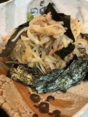 カレーは市販のレトルト。サラダは適当に作ったレシピを一応(^^ゞカッターで千切りした大根に塩して水けを抜いておき、ツナと三つ葉を混ぜてゴマ油、酢、醤油、塩で調味し、焼き海苔をちぎって添えただけ。