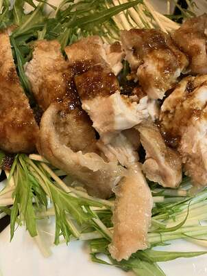 今日のQPで見た料理。皮を取った鶏胸肉の厚みを二等分に切り、それぞれフォークで細かい穴を開けてから軽く塩胡椒しカタクリ粉をまぶす。フライパンに油少々とバターをたっぷり入れて火を通し、ぶつぶつ泡が出て来たら肉を入れ、両面に3分ずつ火を通してから取りだしてしばらく置いておく。同フライパンに味醂、醤油、レモン汁、おろしニンニクを加えてソースにし、水菜を敷いた上に切って置いた肉にソースをかけ、黒胡椒を振って仕上げた。意外と手っとり早く出来るのでオススメかも!