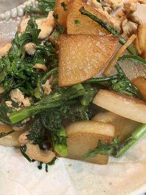 先週のQP料理。オリーブ油で薄切りニンニクを炒めてからトンカツ用の豚ロース肉と縦薄切りした玉ネギを炒め合わせ、ワタシは好みで輪切りにしたレンコンを加えてから白ワインを振りかけ蒸し煮で火を通し、赤味噌、味醂、粗挽き粒マスタード、水を混ぜ合わせたソースをからめ炒めて仕上げた。豚肉は筋切りして塩を振ってから薄力粉をまぶして炒めること。赤味噌で和風っぽい味つけなのになぜオリーブ油 (?_?) という気もしたが、オリーブ油でニンニクを炒めたらたしかに香りはいいです(^^)/