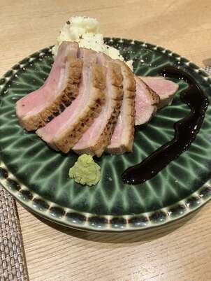刺身の盛り合わせ、鴨ロース、揚げ里芋の山椒風味、茶碗蒸し、鯖サンドほか