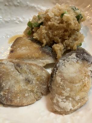 今日のQPで見た料理。ブリの切り身は削ぎ切りにして塩を振り、しばらく置いてから水気を拭き取りカタクリ粉をまぶして油で両面かりっと焼く。これにおろし生姜と、小口切りにした小ネギを混ぜ合わせて味醂、黒酢、醤油で調味した大根おろしを添えた。味醂は電子レンジで煮きってアルコール分を飛ばしておくこと。この黒酢おろしは肉にでも合いそうです∈^0^∋