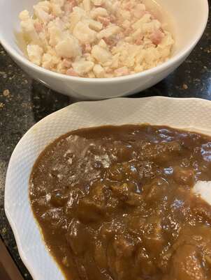 カレーは市販のレトルト。スープは近所の八百屋で埼玉県産のカリフラワーがお買い得だったので以前にQPで見た料理のレシピで作ったもの。ベーコンとブロッコリーを細かく切ってオリーブ油で炒めてから水を加えて10分ほど煮込み、塩胡椒で調味しただけ(^^ゞ