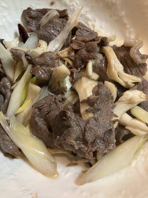 近所のマルエツが和牛3割引きセールして、エリンギもお買い得だったので先月見たQPレシピで作ってみた。ゴマ油で生姜の千切りと種を取った鷹の爪を炒めて、香り立ったら塩とカタクリ粉をまぶした牛肉を炒め、さらに斜め切りした長ネギと細く裂いたエリンギを炒め合わせて酒と塩で調味しただけ。