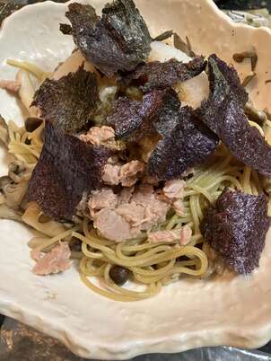 今日のQPで見た料理。舞茸とシメジをオリーブ油で炒め、硬めに茹でたパスタと茹で汁とツナ缶の汁を加えてしばらく炒め合わせ、大根おろしとツナをトッピングして柚子胡椒を入れたポン酢をかけて仕上げに焼き海苔を散らす。こう書くと非常に簡単に出来そうだが意外とメンドクサイです(^^ゞ