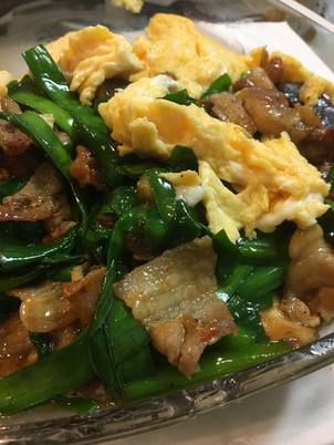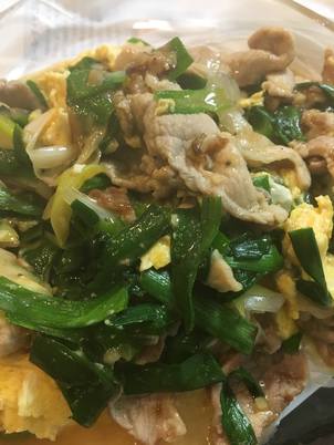今日のQPはつい最近したのと見かけそっくりだが味つけが違う全く別の料理でした(^^ゞ酒塩で下味しカタクリ粉をまぶした豚を炒め、生姜とニンニクのみじん切りを加えて香り立ったら長ネギとニラを入れて強火でさっと炒め合わせ、酒醤油砂糖少々胡椒で調味し、別に作っておいた炒り卵をふわっと混ぜ合わせて仕上げる。