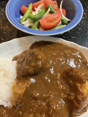 野菜たっぷりカレー、アスパラガスとトマトのサラダ