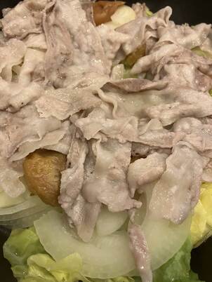 昨日のQP料理。芯ごと1㎝幅の薄切りにした春キャベツをフライパンに敷き並べ、新玉ネギの薄切りと、ちぎった梅干しを載せ酒を回しかけて4分ほど火を通し、さらに軽く塩を振った豚しゃぶ肉をトッピングして3分以上蒸して仕上げるだけ。とてもカンタンな調理でおいしく食べられるし、後片づけもラクなのでお忙しい方にオススメ!