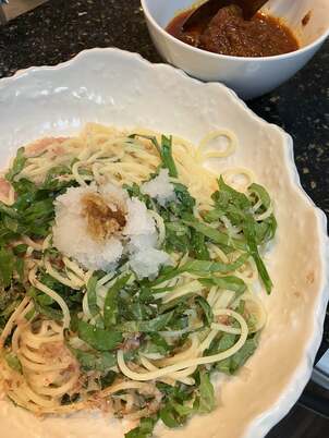 青じそ明太パスタ、鶏肉のトマト煮込み