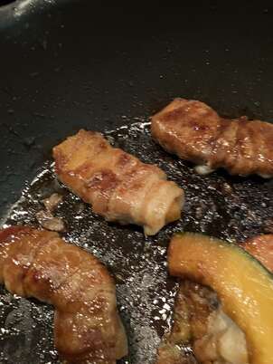 先日のQPで見た料理。厚みのある薄切りにして皮を剥いたカボチャに、塩胡椒した豚バラ肉を巻きつけ、カタクリ粉を振ってフライパンで両面から火を通し、醤油と水と砂糖、酢少々、シナモン(の代わりにワタシは五香粉を使用)の合わせ調味料を加えて煮転がしただけ。カボチャはレンチンしての時短調理をQPは勧めたが、カボチャは火が通りやすいのでレンチンしなくても大丈夫かと(^^ゞ