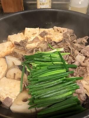 近所のマルエツで鹿児島産の黒毛和牛がお買い得だったので、以前に見たQPレシピで作ってみた(^^ゞ細切れ牛肉と八つ割りした焼き豆腐、皮付き半月切りしたレンコンを酒と味醂と砂糖で調味した出汁でしばらく煮て、塩と醤油と昨日の万能ネギ(QPはワケギを使用)を加えてさらに煮込んだだけ。肉はさっと湯通ししてアクを取ってから煮ること。
