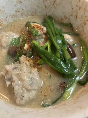 今週のQPで見た料理。レンコンをすり下ろして出た汁にカツオだしを足して煮立て、すり下ろしたレンコンに塩と薄力粉をプラスして練り混ぜた団子を煮立てた出汁に投入し、火が通ったら椎茸の薄切りと青ネギを加え、味噌を溶き入れて仕上げた。レンコンは皮付きのまますり下ろしてOKです!